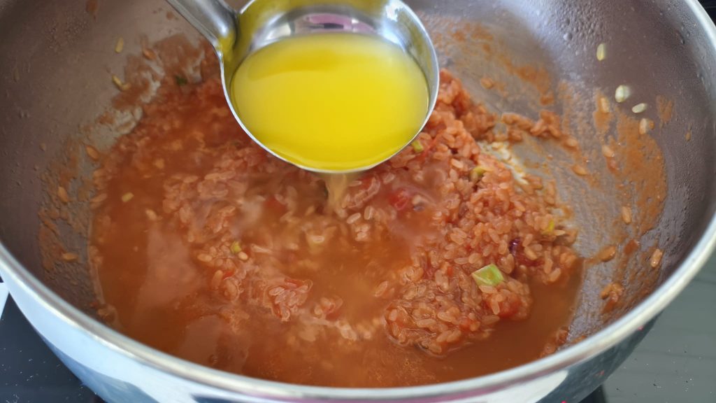Mélange et commence à ajouter le bouillon chaud petit à petit, en continuant de remuer.