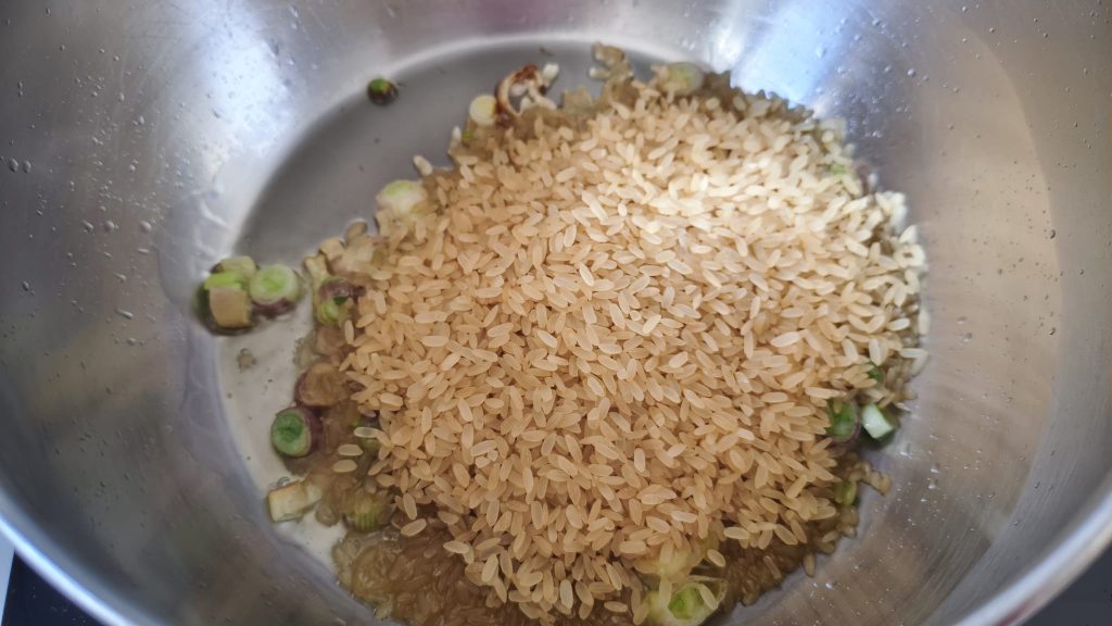 Ajoute le riz et fais-le nacrer pendant 1 minute, jusqu’à ce qu’il devienne brillant.