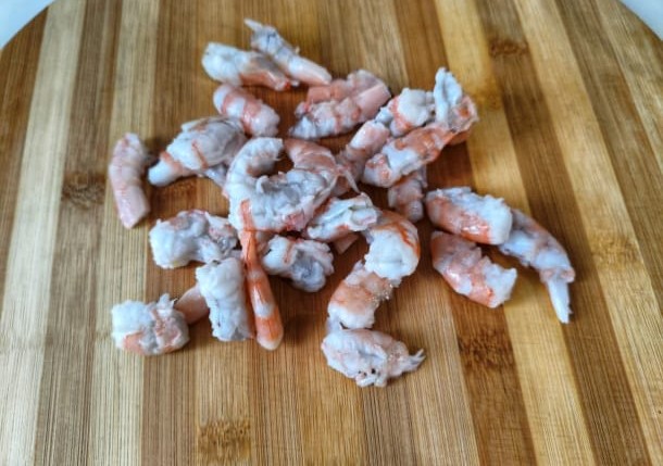 Coupe la moitié des crevettes en morceaux et laisse les autres entières.