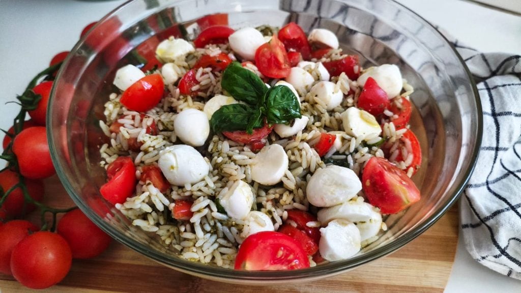 Le mieux, c’est qu’il faut vraiment peu d’ingrédients : riz basmati ou riz pour salades, ton pesto préféré, tomates cerises fraîches coupées en deux et petites mozzarellas qui fondent presque en bouche. Il suffit de cuire le riz, le laisser refroidir, ajouter le tout et mélanger.