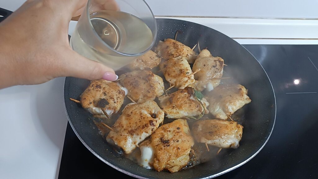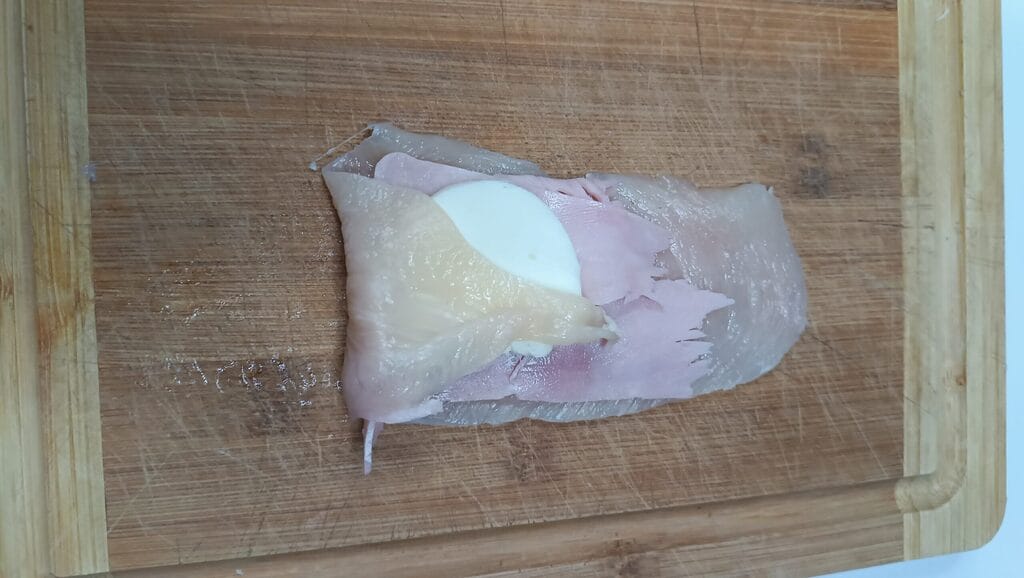 Les préparer est vraiment facile. Il suffit d’étendre les tranches de jambon cuit sur des fines tranches de poitrine de poulet et d’ajouter une farce : cela peut être un fromage crémeux, j’ai utilisé du galbanino mais le robiola ou le mascarpone conviennent aussi, ou peut-être des légumes grillés, comme des courgettes ou des poivrons. Roulez le tout délicatement et fixez-le avec un cure-dent pour le maintenir en forme.