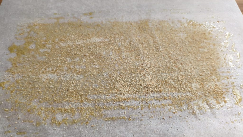 • Étaler une feuille de papier sulfurisé sur le plan, verser un filet d’huile et saupoudrer de chapelure. Disposer les tranches d’aubergines grillées les unes à côté des autres et légèrement superposées. Saler et ajouter le jambon cuit et les tranches de scamorza fumée.