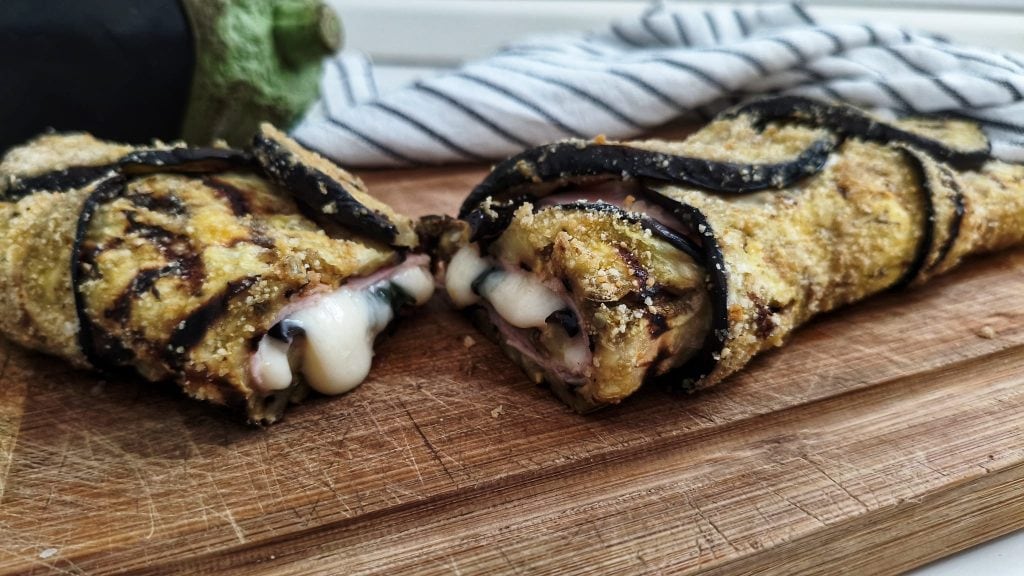Il suffit de griller les aubergines en tranches, bien fines, puis de les étaler sur un plan et de les garnir avec du jambon cuit et de la scamorza fumée. À ce stade, on les roule délicatement et on les met au four juste le temps de faire fondre le fromage — 15 minutes à 180°C et le tour est joué. Quand ça sort du four, c’est délicieusement parfumé, avec ce cœur fondant qui fait tout de suite envie. C’est aussi délicieux froid, parfait à emporter au travail ou pour un buffet entre amis.