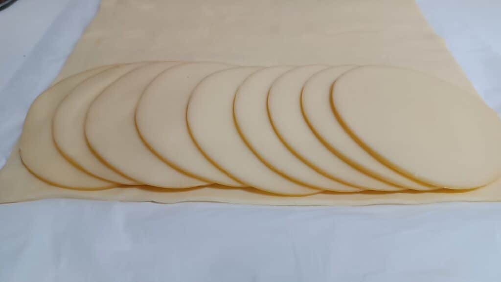 • Dérouler la pâte feuilletée sur un plan de travail et du côté le plus court, garnir avec des tranches de scamorza et de jambon