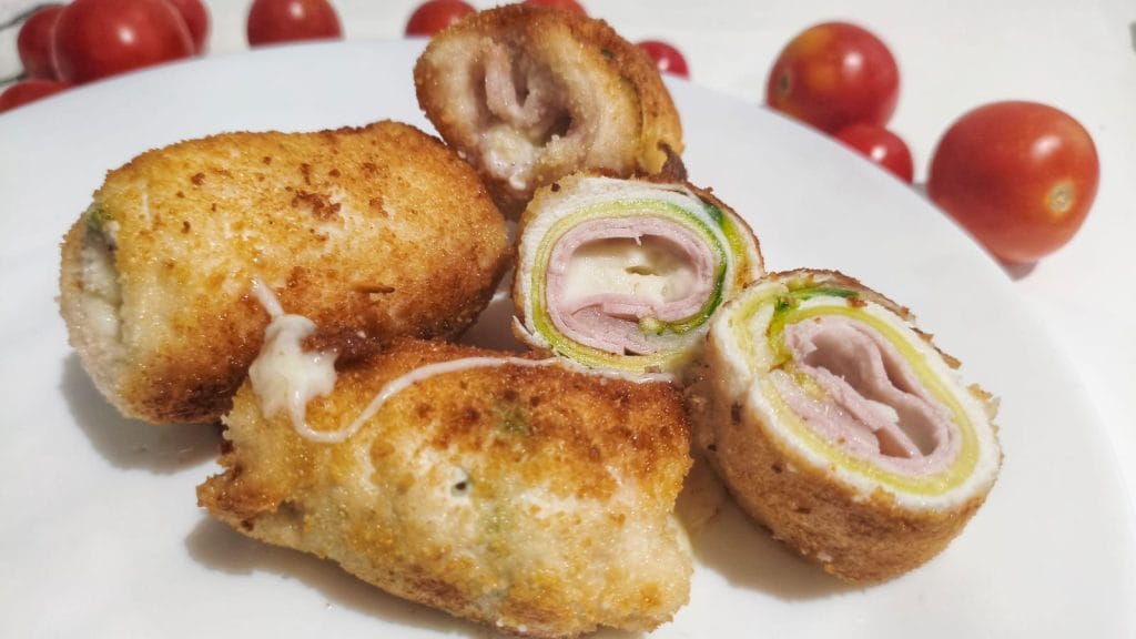 La belle chose est que cette recette facile de poitrine de poulet se prépare en très peu de temps et avec peu d’ingrédients. J’ai utilisé la mandoline pour trancher finement les courgettes — comme ça elles deviennent fines et cuisent en un instant. Puis j’ai fait des couches très simples : une tranche de poitrine de poulet, une de courgette, une de jambon cuit et un morceau de galbanino. On enroule tout délicatement, on fixe avec un cure-dent, on les passe rapidement dans la chapelure et hop, dans la poêle avec un filet d’huile. Quelques minutes de cuisson suffisent et le résultat est à se lécher les babines.