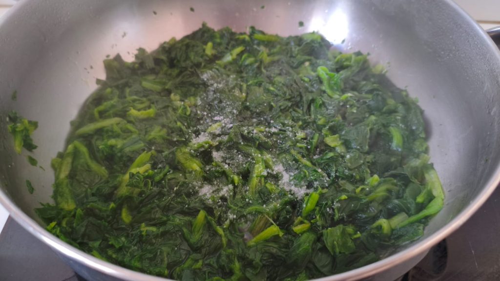 Nettoyer les épinards et les faire bouillir dans de l’eau salée, puis les égoutter et les laisser refroidir dans un bol.