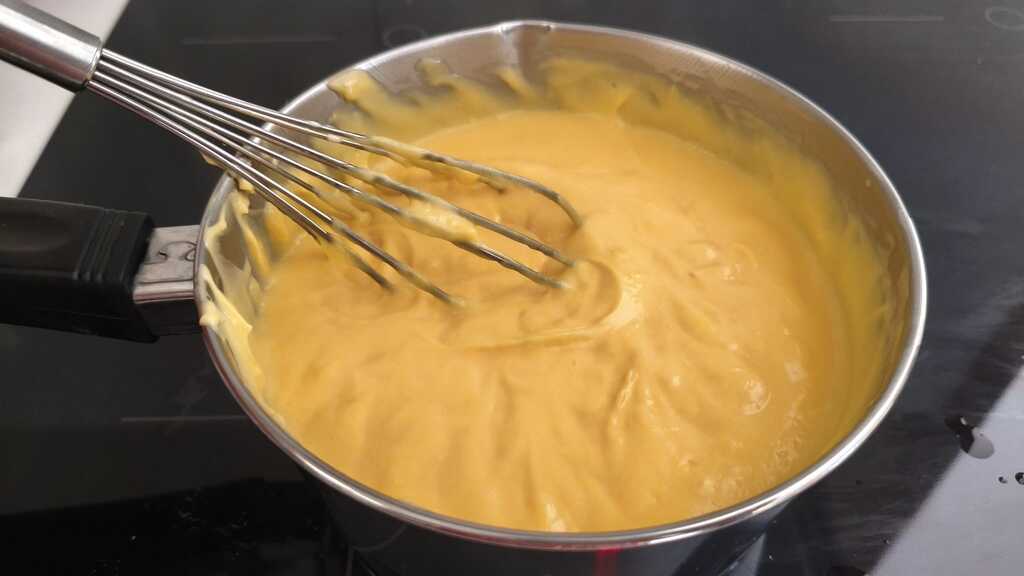 Retirez le zeste de citron du lait et versez-le dans le mélange de jaunes d’œufs. Mélangez bien et remettez sur le feu.