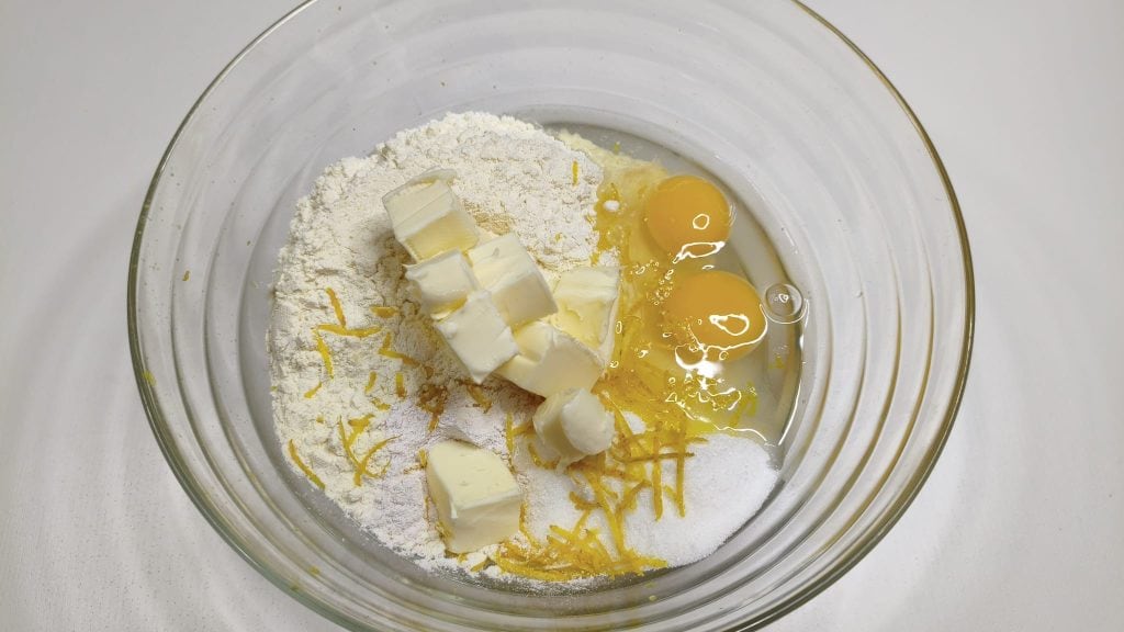 Dans un bol, mettez tous les ingrédients : la farine, les œufs, le zeste de citron, le beurre, le sucre et la levure. Pétrir rapidement et envelopper la pâte dans un film plastique. Laissez reposer au réfrigérateur pendant 40 minutes.