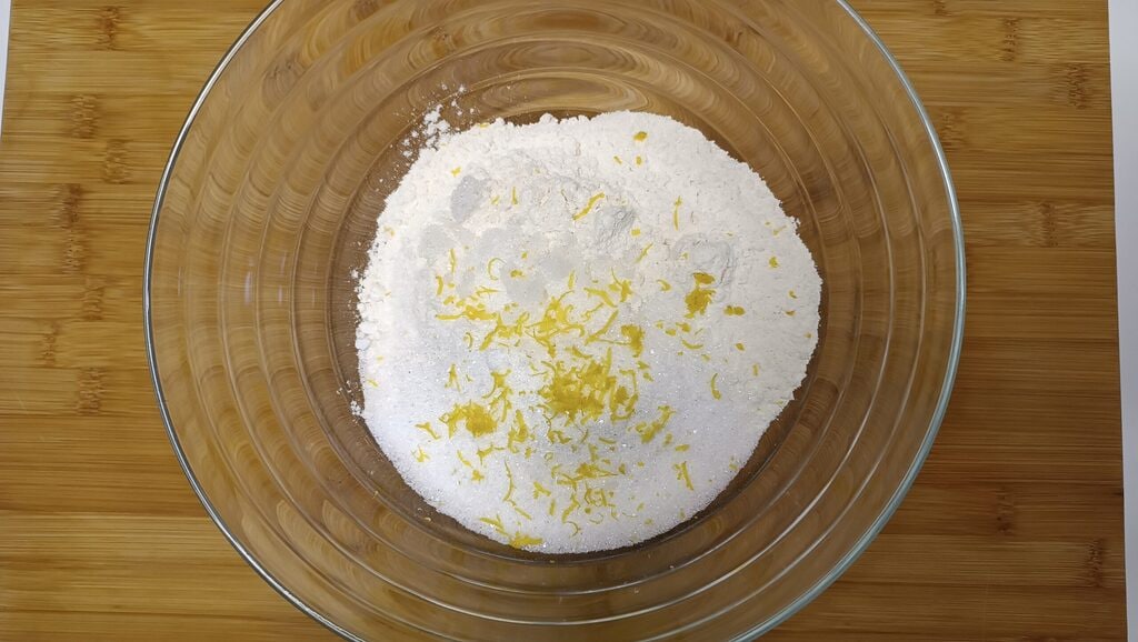 Préparons la pâte sablée en mélangeant farine, levure, sucre, citron et 2 œufs.