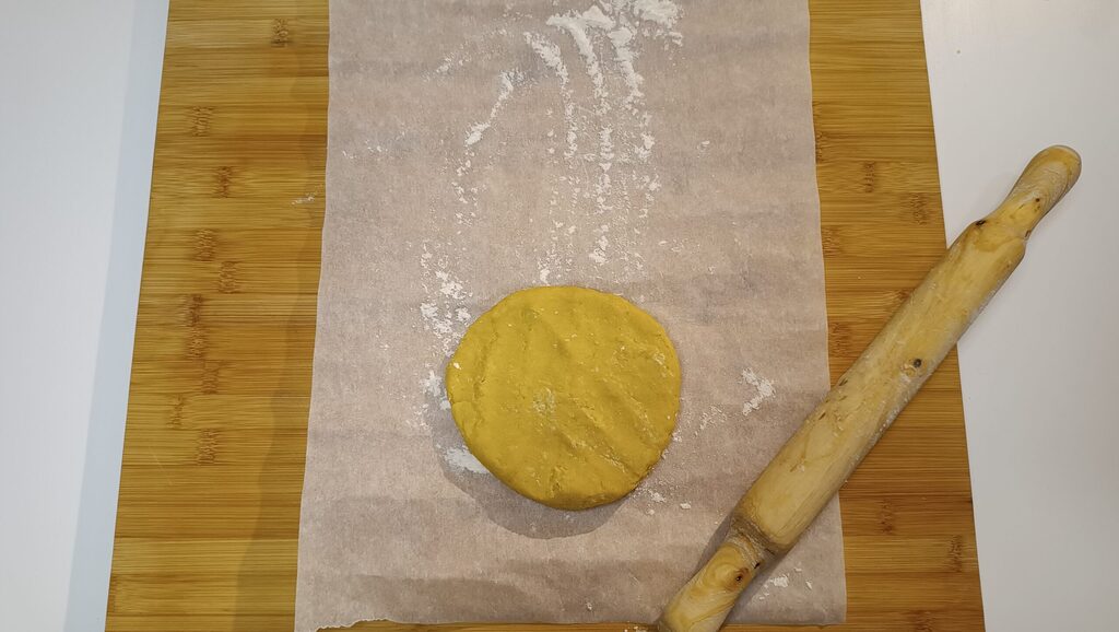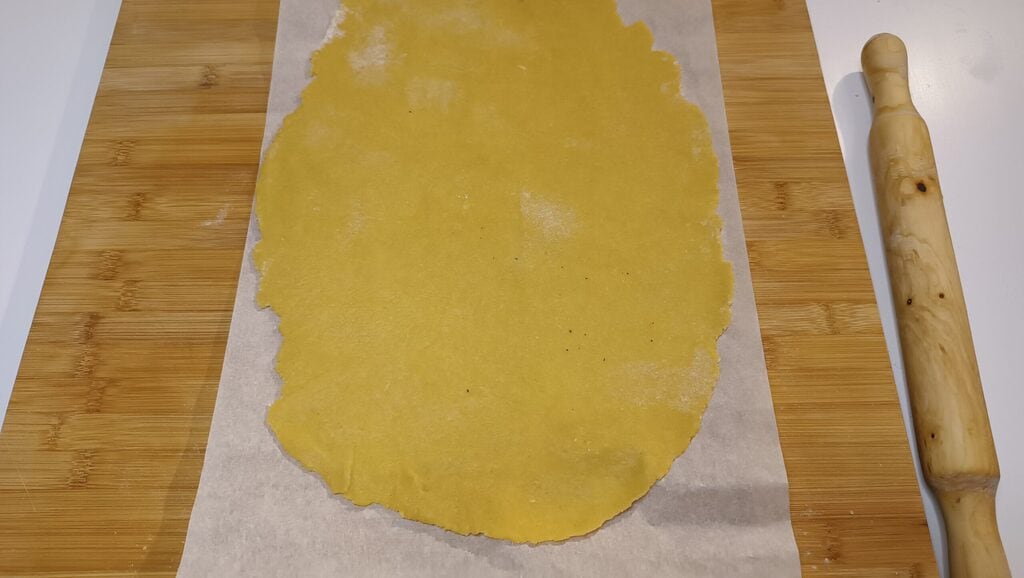 Fariner une feuille de papier sulfurisé et étaler la pâte sablée dessus en essayant de lui donner une forme rectangulaire