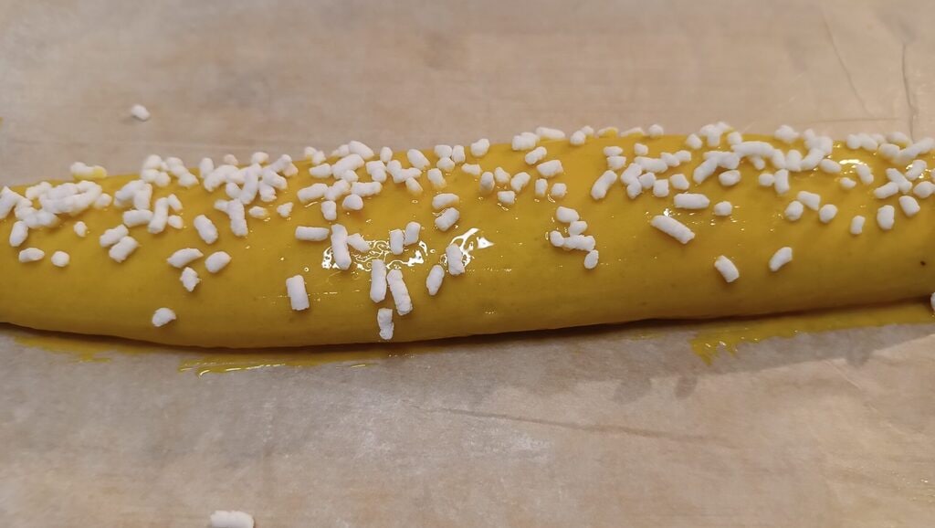 Brosser avec l’œuf battu et parsemer de sucre en grains
