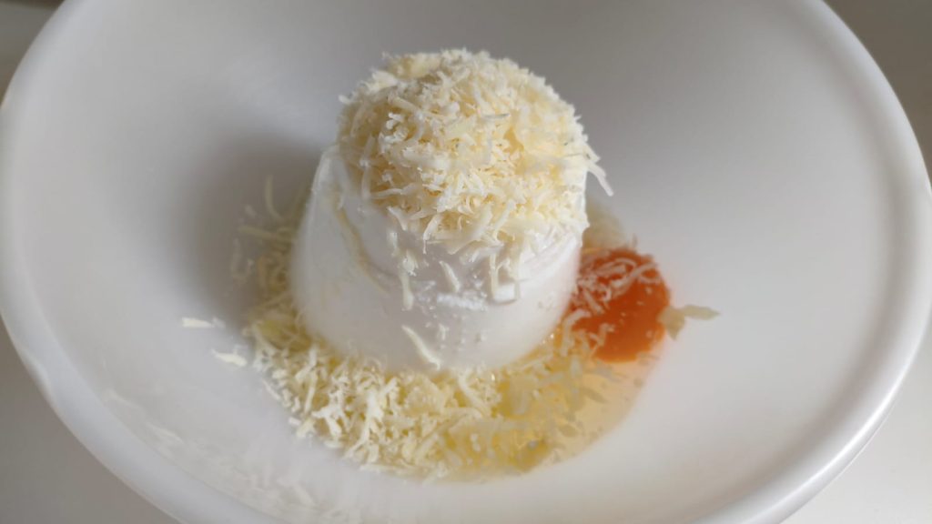 • Dans un bol, mélanger la ricotta, les œufs, le pecorino et une pincée de sel.