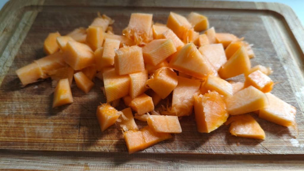 Commencer par nettoyer la courge : enlever la peau, ses filaments internes et la couper en dés. Couper aussi l’échalote et la cuire dans une poêle avec un filet d’huile. Dès qu’elle est cuite, ajouter la courge.