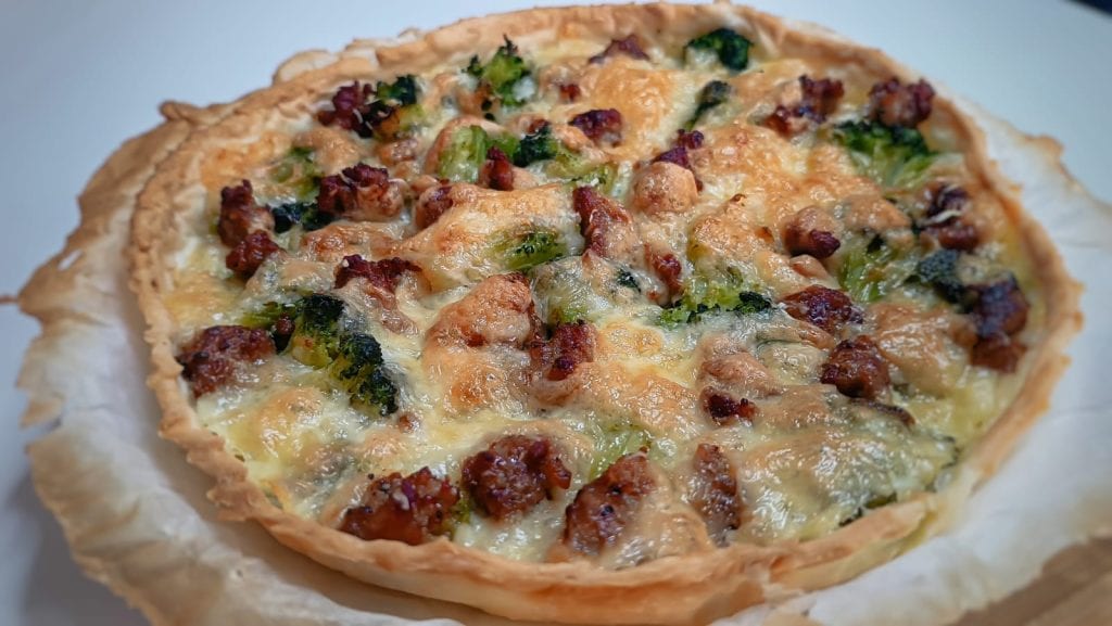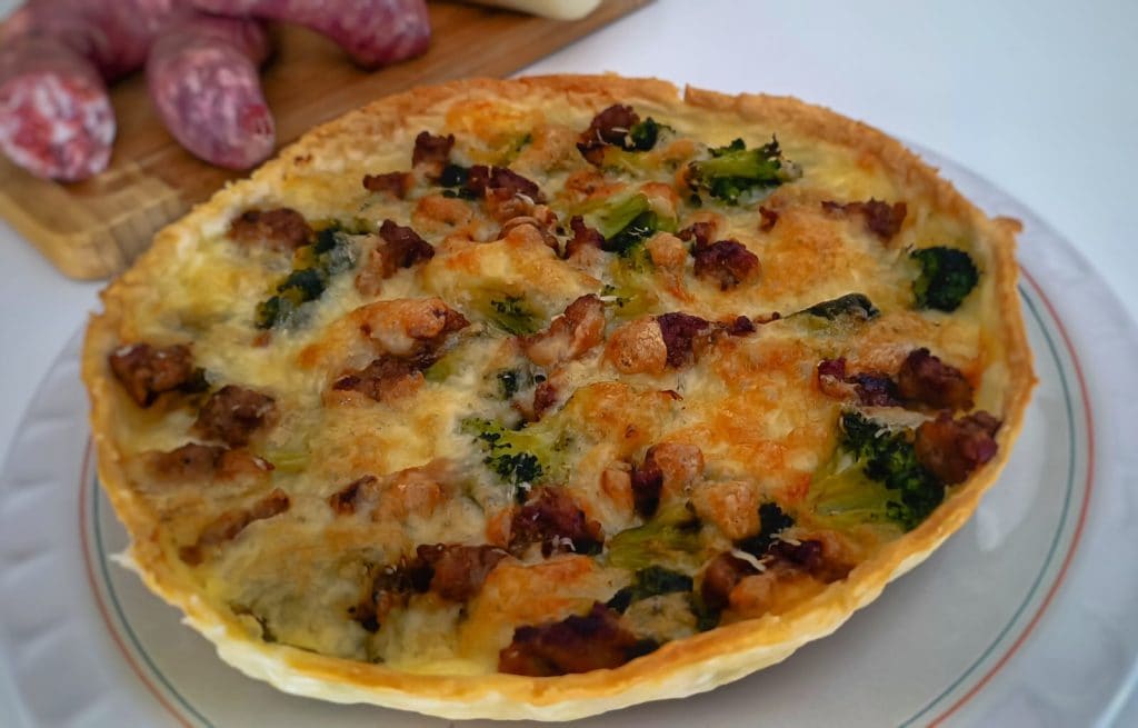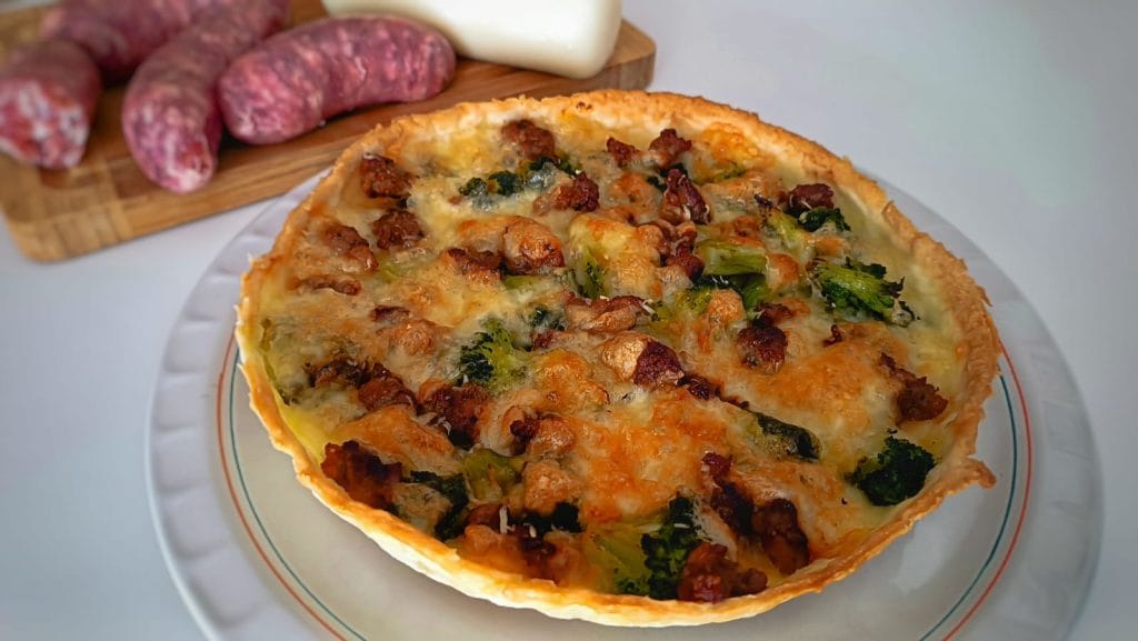 On commence par cuire les brocolis et la saucisse, en les assaisonnant avec un filet d’huile d’olive et une gousse d’ail pour rehausser les saveurs. Une fois prêts, on les mélange avec le galbanino en dés et on répartit le tout uniformément sur la base de pâte feuilletée déjà étalée dans un moule. Il suffit de refermer les bords, si on le souhaite, on peut les badigeonner avec un peu d’œuf battu pour obtenir des bords brillants et enfourner : le parfum qui se répandra sera irrésistible.