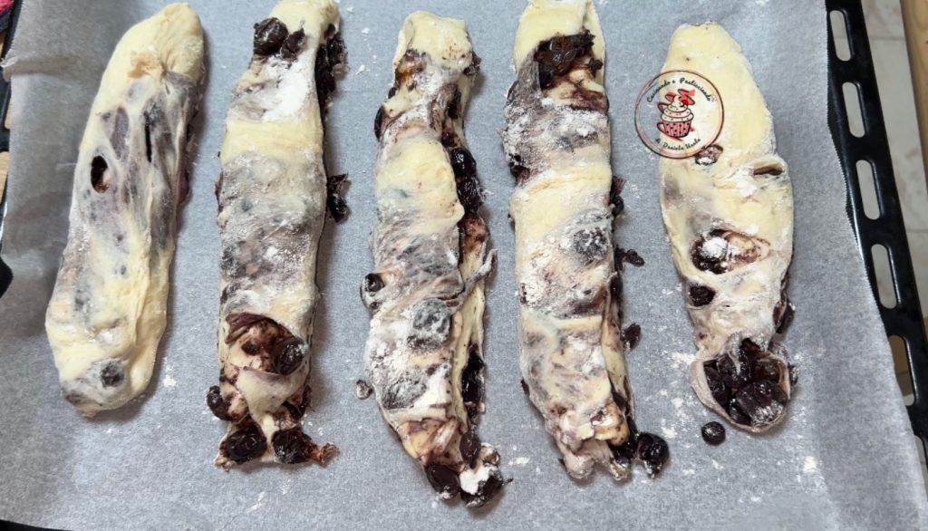 Transférez la pâte levée avec les olives sur le plan de travail et à l’aide d’une corne, formons les baguettes. Ne leur donnez aucune forme, elles doivent être aussi rustiques que possible.