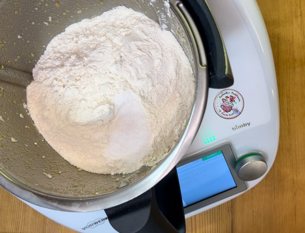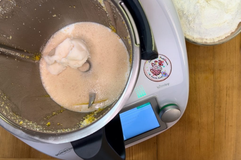 Mettre dans le bol le sucre, le zeste de citron et d’orange, pulvériser 30 secondes à vitesse 9. Rassembler au fond avec la spatule.