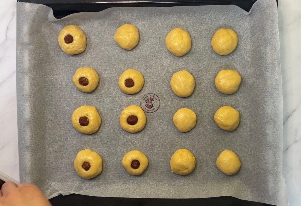 Huilez-vous légèrement les mains et formez les biscuits en petites boules. Disposez-les sur la plaque recouverte de papier cuisson. Posez une noisette au centre de chaque biscuit et faites cuire à 180° pendant environ 20 minutes.
