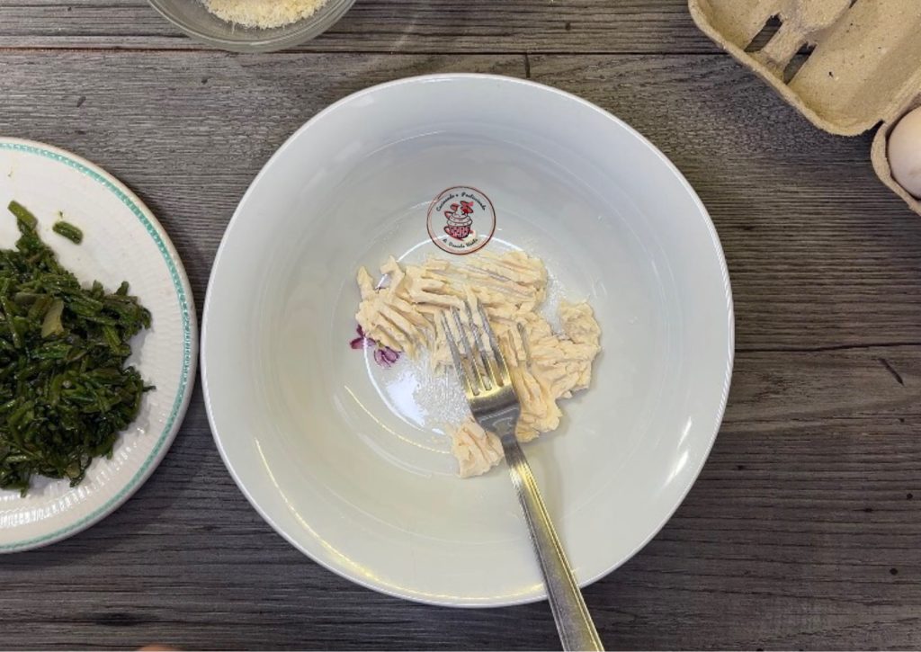 Dans un bol, écrasez les fromages frais (formaggini) à la fourchette.