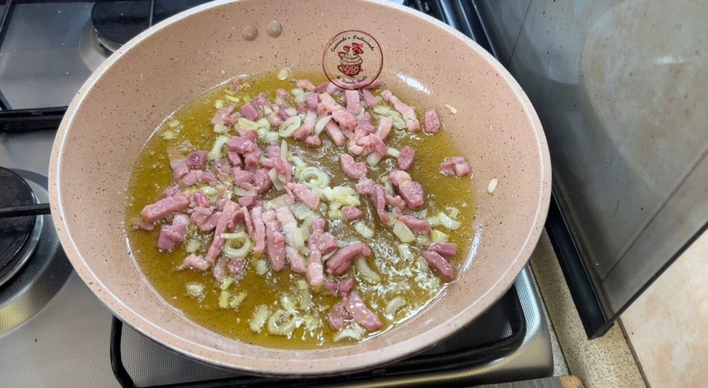 Dans une poêle, faire revenir l’oignon haché dans un peu d’huile et y ajouter le lard.