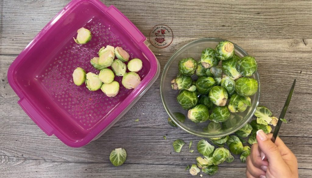 Enlever les deux premières feuilles des choux, les laver et les couper en deux. Les cuire à la vapeur pendant quelques minutes. Je le fais au micro-ondes en utilisant sa fonction spécifique.