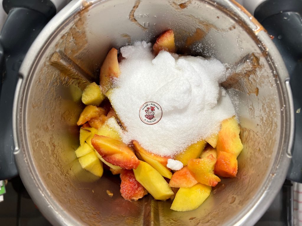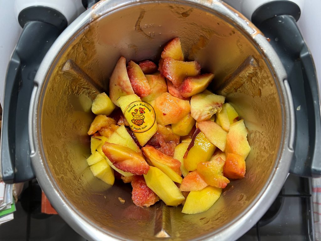 Laver les pêches, retirer la peau, les couper en morceaux et les mettre dans le bol du Thermomix.