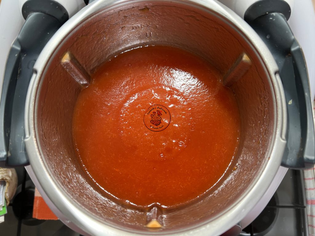 Une fois la cuisson terminée, vous pouvez décider de laisser la confiture en morceaux ou de la mixer comme je l’ai fait pendant 10 secondes à vitesse 8.