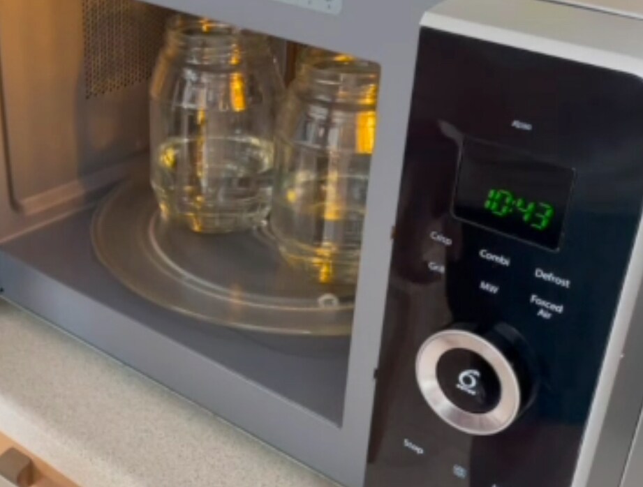 Pendant ce temps, stériliser les bocaux. J’utilise le micro-ondes. Je lave bien les bocaux à l’eau chaude, je les remplis à moitié d’eau et je mets le micro-ondes en marche pendant 10 minutes.
