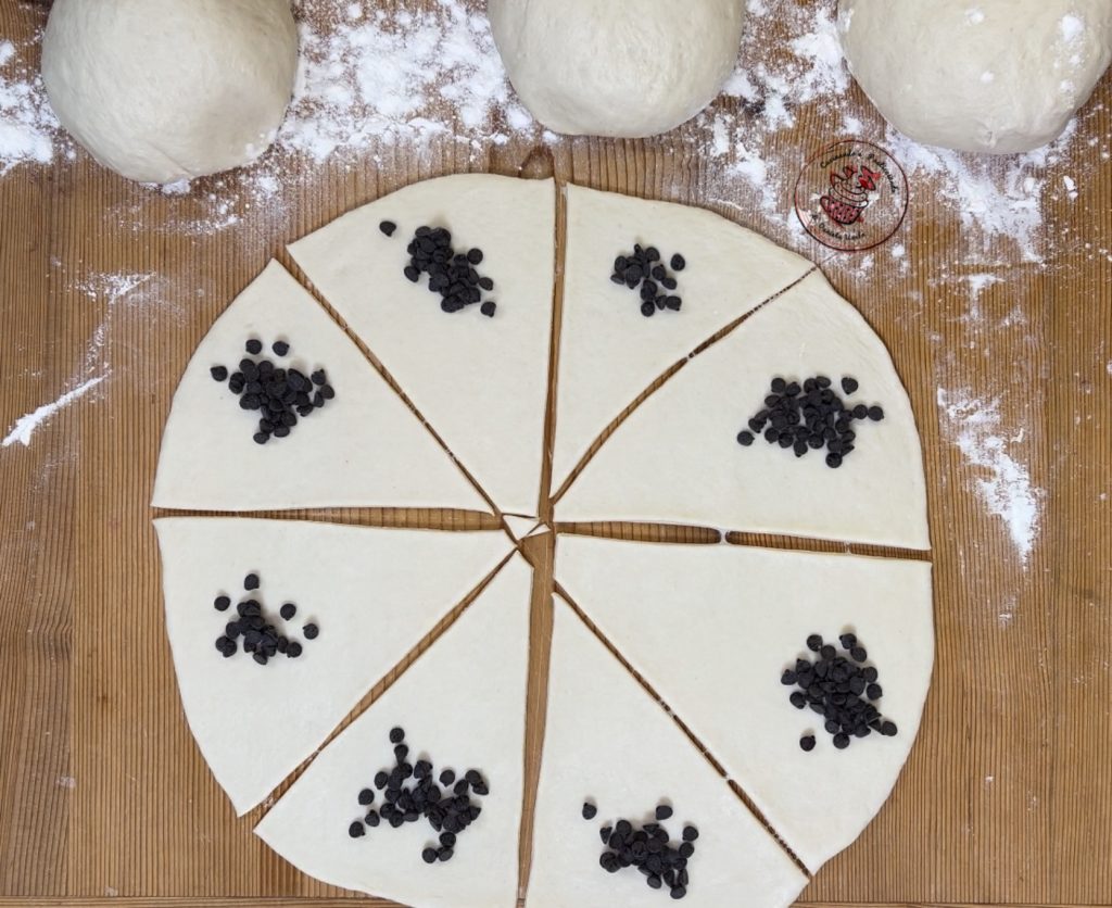 Divisez la pâte en 4 boules et étalez-les au rouleau à pâtisserie. De chaque disque, découpez 8 triangles. Placez une poignée de pépites de chocolat au centre.