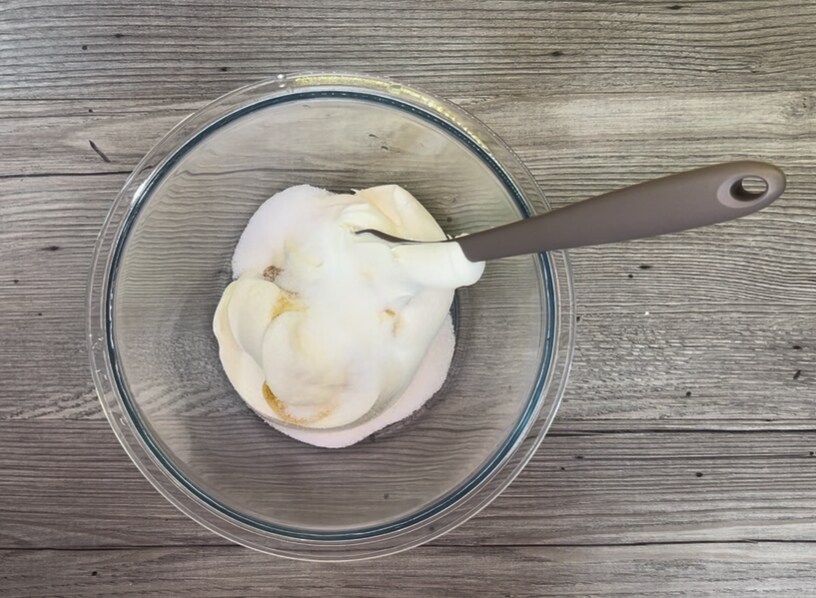 Dans un bol, mélangeons le mascarpone avec le sucre et la vanille.
