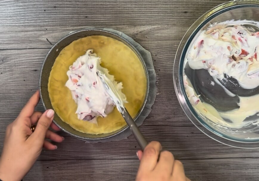 Transférer la crème de mascarpone et fraises sur la base préparée précédemment.