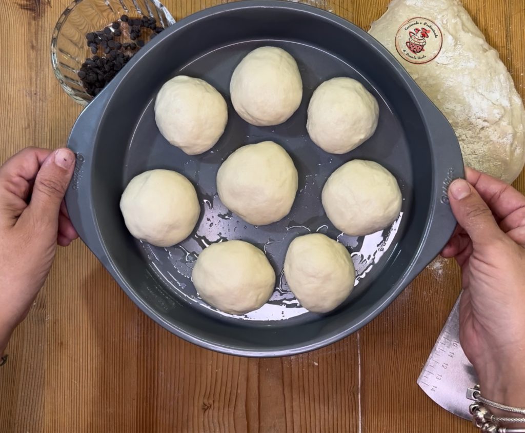 Placez ensuite les boules sur le moule graissé, légèrement espacées, et laissez lever jusqu’au doublement.