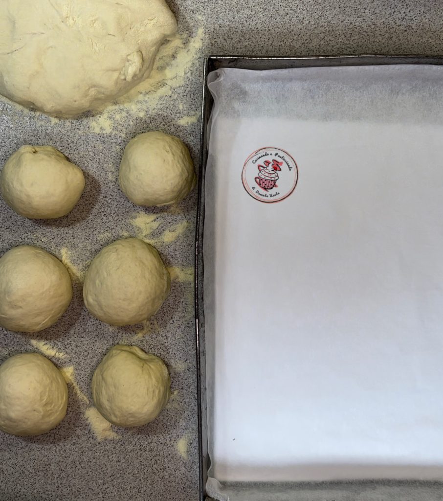 Transférer la pâte sur le plan de travail et diviser en morceaux d’environ 100 g et former des boules.