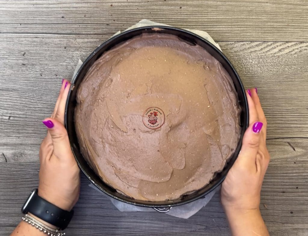 Transférer le mélange dans le moule, avec le fond recouvert de papier sulfurisé, et bien lisser la surface. Cuire à 170° pour environ 50 minutes.