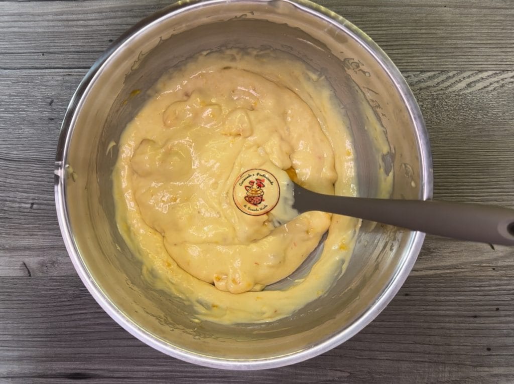 Ajoutez 2 pêches, lavées et sans peau, coupées en dés à la pâte et mélangez encore.