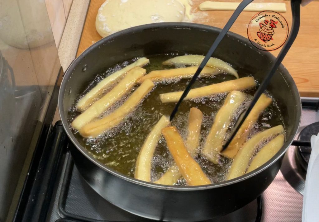 Quand la pâte a levé, étalez-la avec le rouleau à pâtisserie et découpez des bandes avec le coupe-pizza. Laissez reposer 10 minutes et pendant ce temps, faites chauffer l’huile.