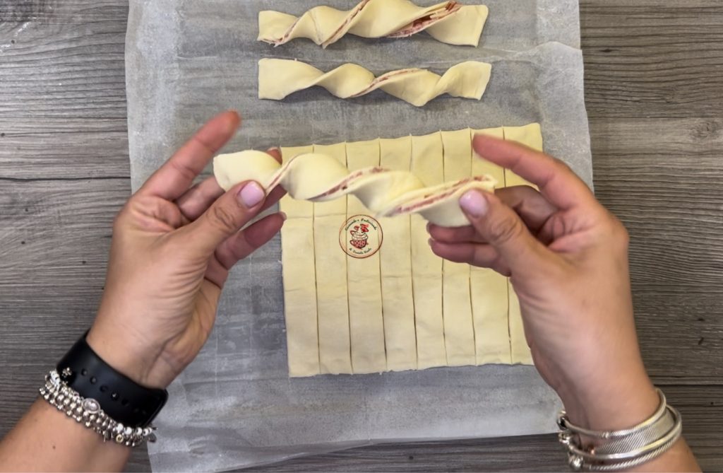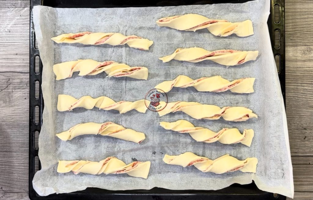 • Fermer la pâte feuilletée, couper des bandes pas trop larges et les enrouler.