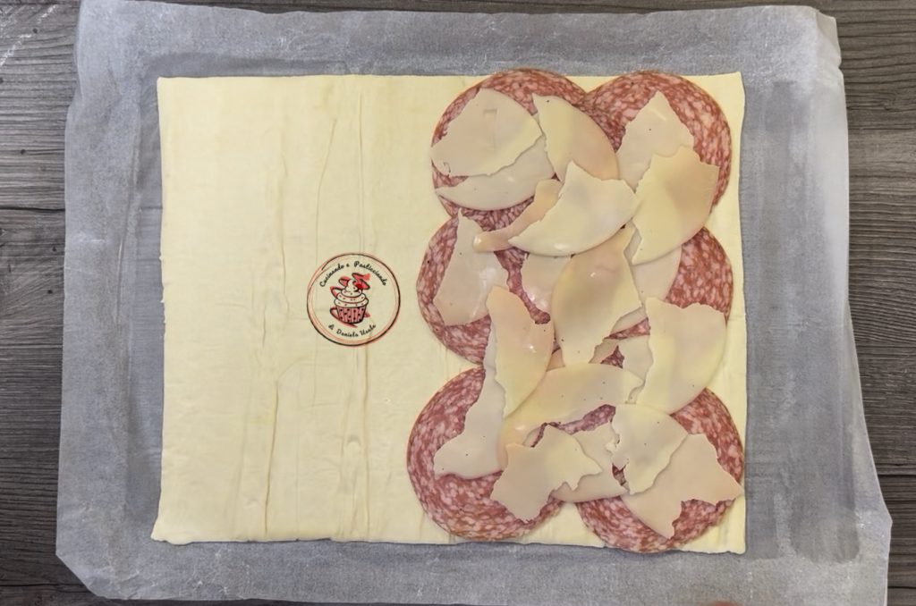 • Étaler le rouleau de pâte feuilletée et positionner les charcuteries sur une moitié.