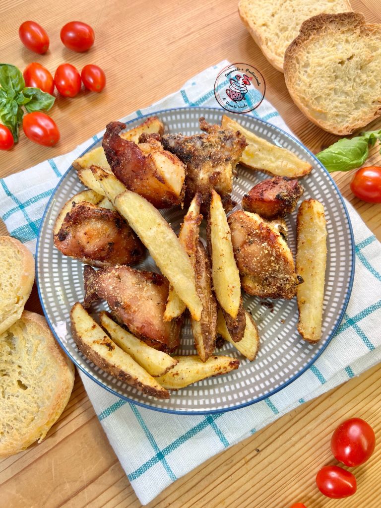 Placer les morceaux de lapin dans le panier de la friteuse, ajouter les pommes de terre coupées en quartiers et passées aussi dans la chapelure, puis ajouter un peu d’huile. (J’utilise le pulvérisateur en spray, vraiment très pratique). Cuire environ 20 minutes à 200°C.