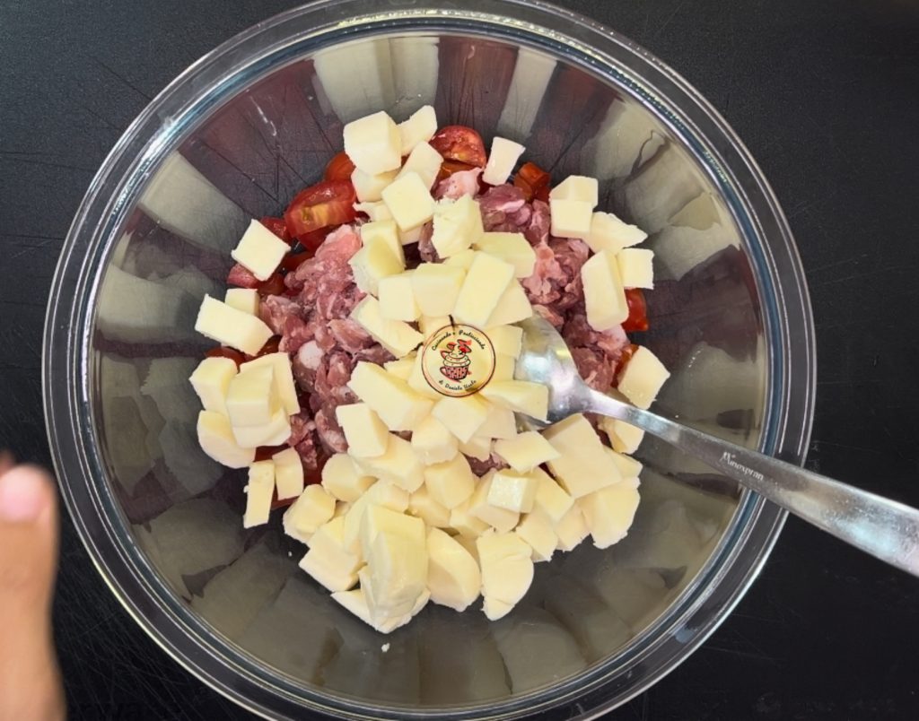 Dans un grand bol, mettre 200 g de tomates cerises lavées et coupées en morceaux, 200 g de saucisse et 200 g de mozzarella coupée en dés. Bien mélanger.