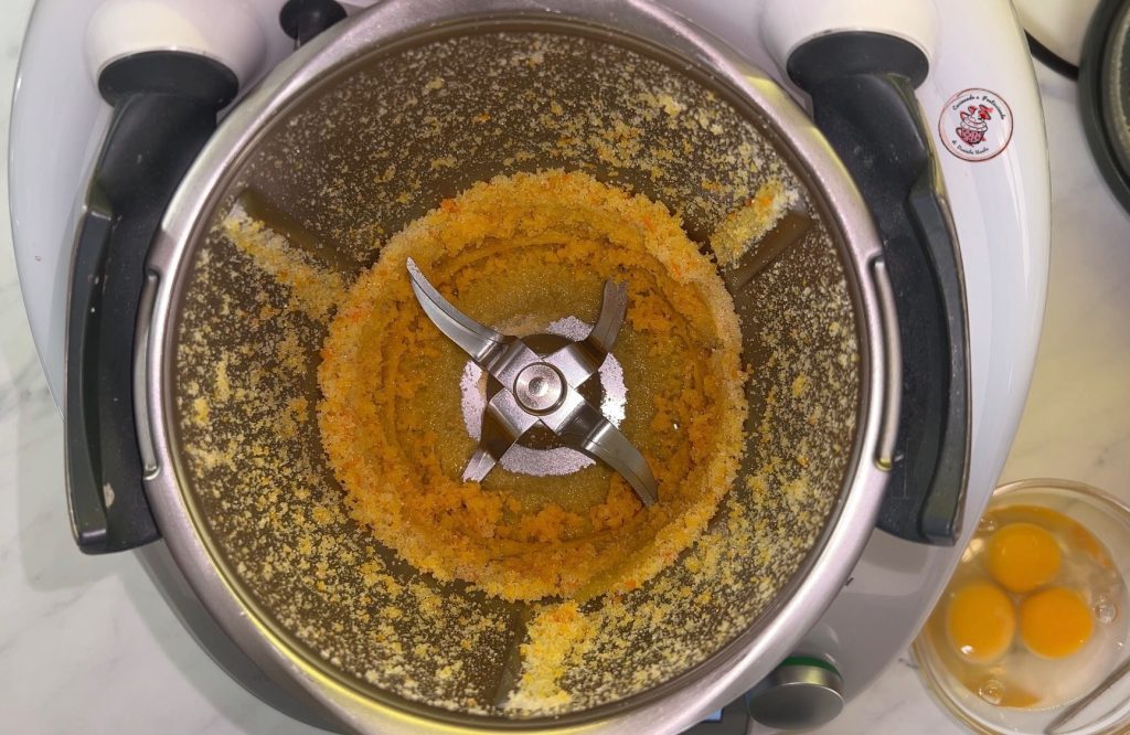 Dans le bol du Bimby, réduis en poudre pendant 10 secondes à la vitesse 10 les zestes d’orange et de citron avec le sucre.