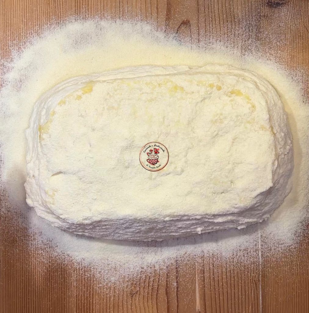 Lorsque la pâte a doublé, saupoudrer la planche à pâte de semoule re-moulinée et renverser la pâte levée. Ajouter un peu de semoule sur la pâte.