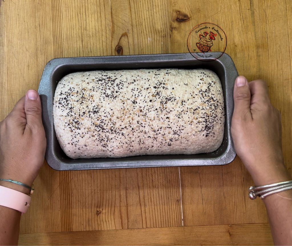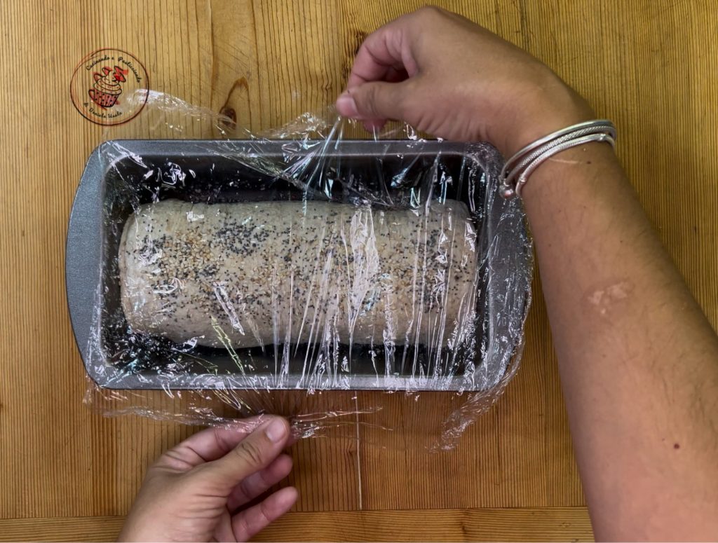 Et je l’ai transféré dans le moule huilé. J’ai badigeonné la surface avec un peu d’eau et ajouté les graines. Puis j’ai couvert avec du film plastique.