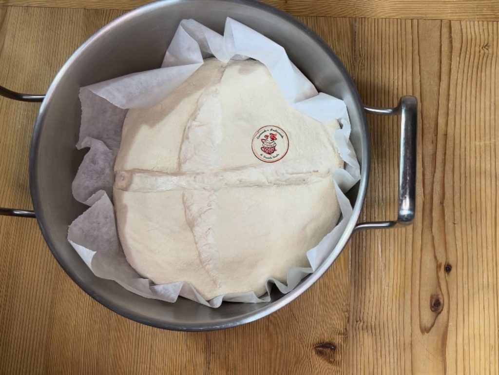 Quand le four atteint la température, transférer le pain dans la cocotte, couvrir avec le couvercle et cuire pendant 30 minutes à 250°C.