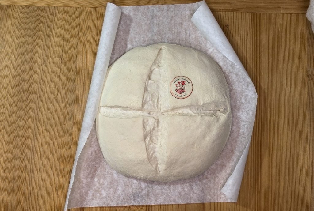 Allumer le four à 250°C avec la cocotte à l’intérieur. Pendant ce temps, transférons la miche sur un morceau de papier sulfurisé et avec le couteau à pain, incisons le pain.
