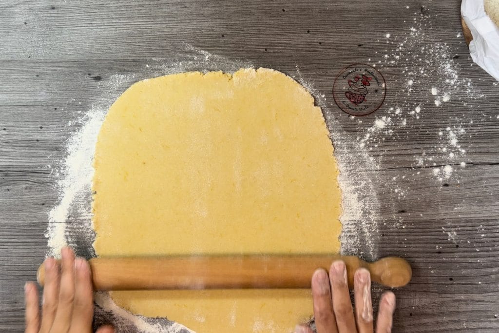 Une fois le temps de repos écoulé, reprendre la pâte sablée et l’étaler sur la planche farinée.