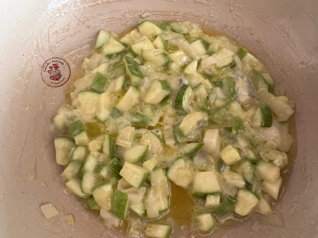 • Coupez la courgette en morceaux et faites-la revenir environ 10 minutes avec de l’huile et du sel, avec l’oignon haché.