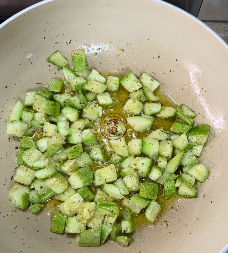 Faire revenir la courgette coupée en morceaux avec l’ail et le persil (dans mon cas séchés) pendant environ 10 minutes.