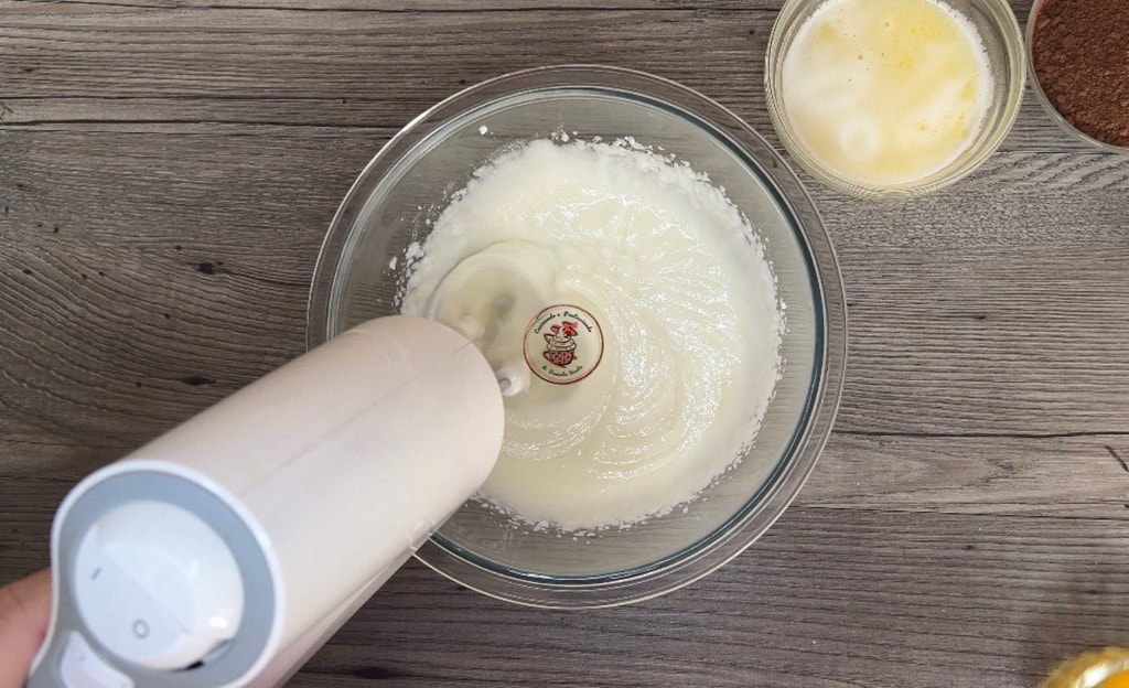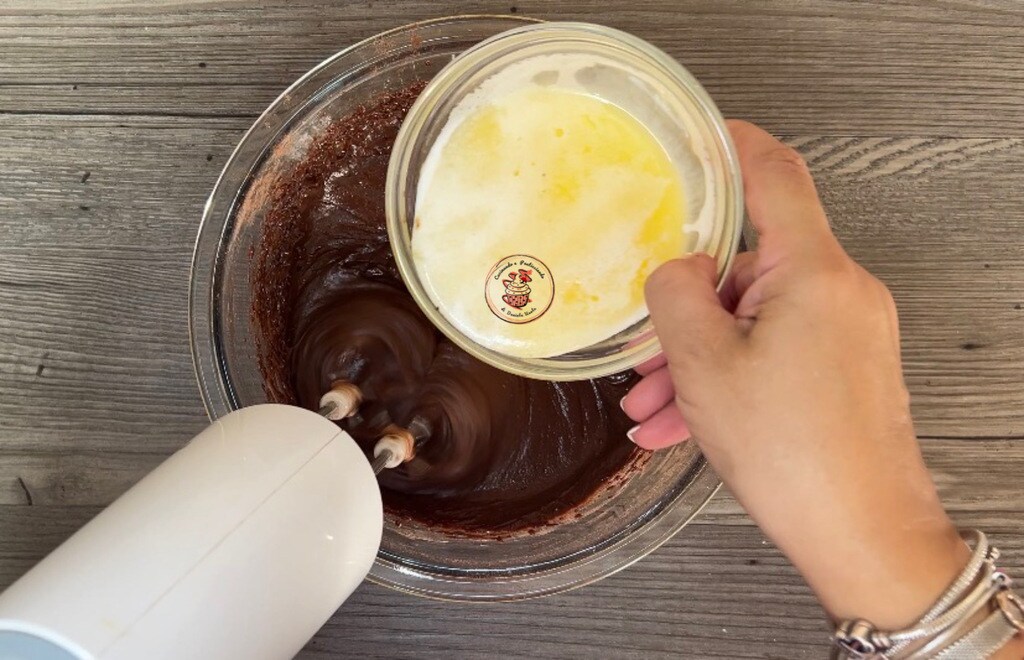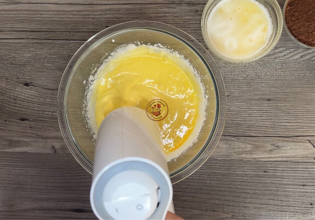 • Ajoutez la farine tamisée avec le cacao et la levure, et continuez à mélanger le tout.
