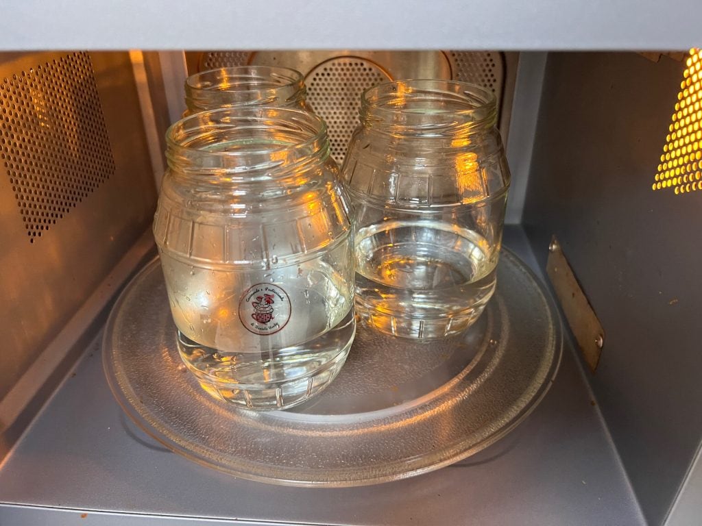 Pendant ce temps, stériliser les bocaux en verre. Je les remplis à moitié et les mets au micro-ondes. Et je laisse fonctionner pendant 10 minutes. Je les laisse dans le micro-ondes jusqu’au moment de les utiliser.
