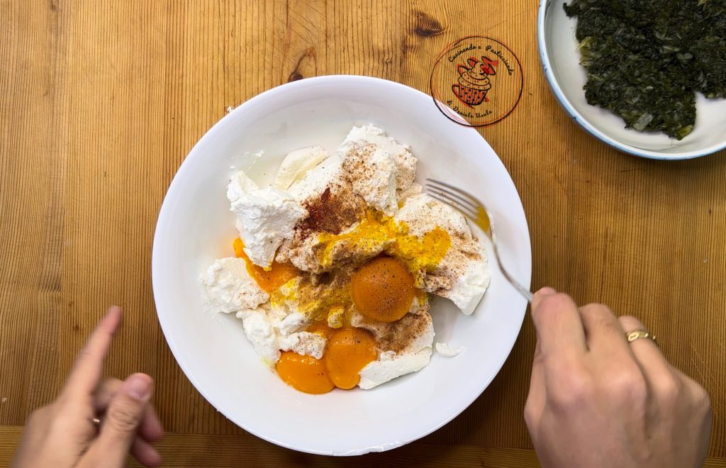 Préparons la farce, pour qu’elle s’imprègne bien. Faisons cuire les blettes, les hacher finement et les réserver. Dans un bol, mettez la ricotta, les jaunes d’œufs, la noix de muscade, le safran et mélangez.